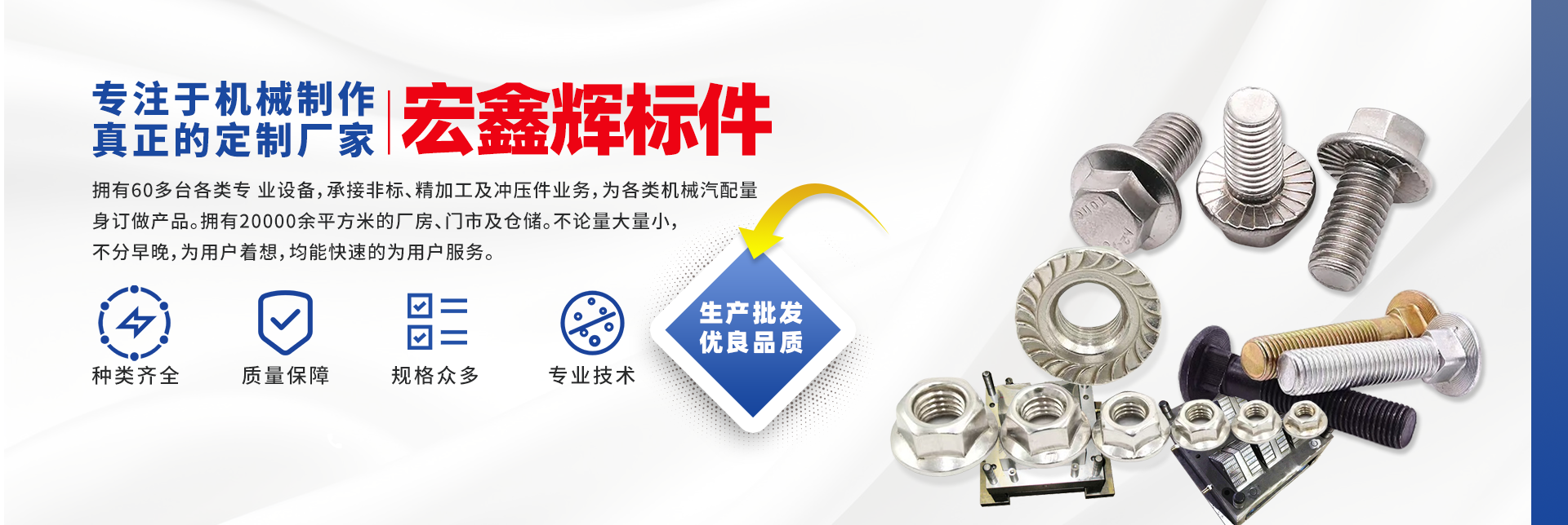 四川宏鑫輝標準件制造有限公司下設:南充市宏輝機械制造有限公司,南充市聚宏機電設備有限公司,公司始建于1994年。為了拓展市場,降低成本,本公司于2007年、2020年分別在南充、 成都、重慶創(chuàng)建了生產基地。擁有60多臺各類專 業設備,承接非標、精加工及沖壓件業務,為各 類機械汽配量身訂做產品。擁有20000余平方米的廠房、門市及倉儲。公司以誠信為本,竭誠為廣大客戶提供服務。不論量大量小,不分早晚,為用戶著想,均能快速的為用戶服務。 公司所生產及代理的產品為業界人士公認的國內、國際優(yōu)等品牌。在產品性能與質量